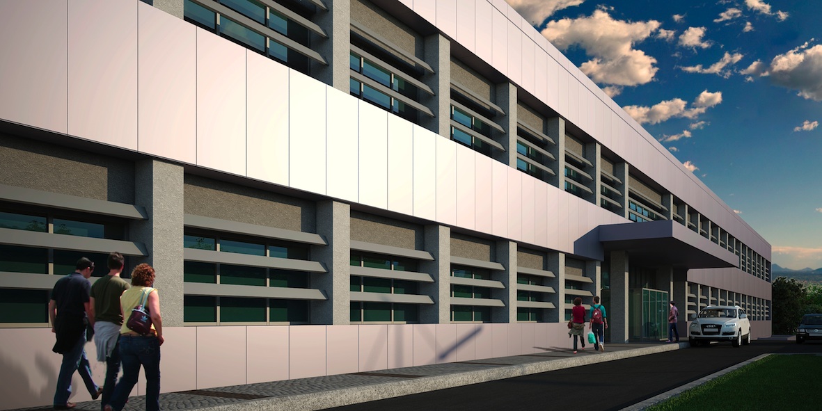 The building is covered with composite aluminium panels. The south, street facing facade has a horizontal character, accentuating the low profile of the Duhok Hospital; with aluminium sun breakers further emphasizing this feeling.