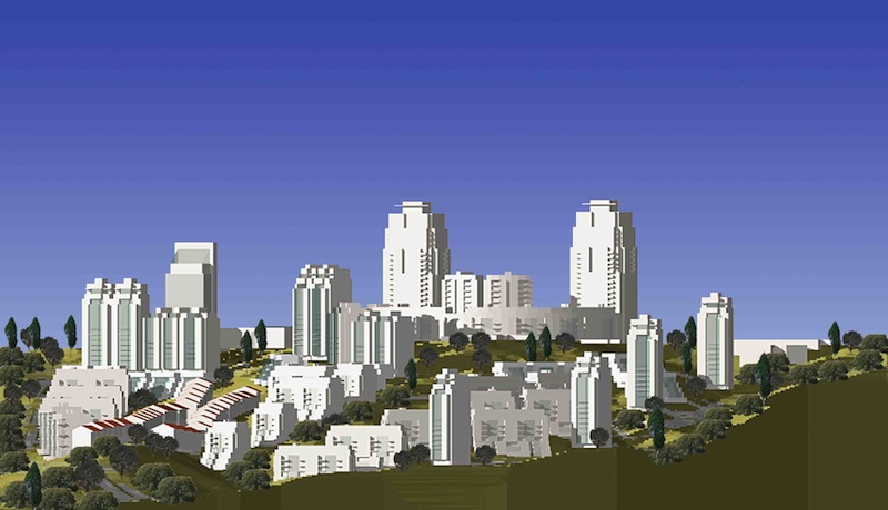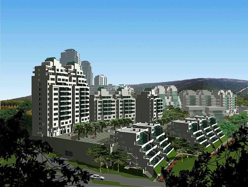 The plateau on the eastern end of the site is dominated by the 25 storey twin plaza blocks and the 12 and 5 storey crescent blocks. Lining threshold to the west of the plaza are the 14 and 8 storey sera (greenhouse) blocks. Along the main 15m. road is the triplex housing.