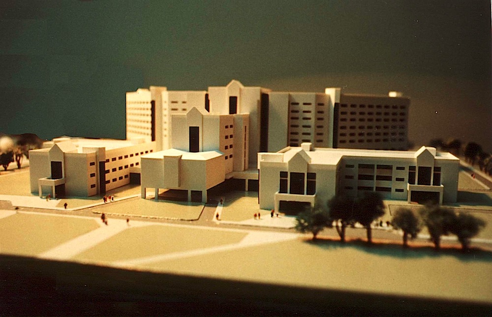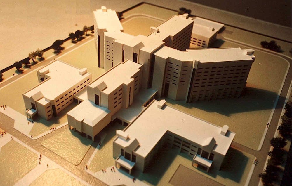 The whole complex is designed linearly around a main spine which is the main "hospital street". This spine starts with a three storey high atrium which serves as a welcoming space for visitors and patients. In front of the atriumed entrance hall is a pedestrian plaza which is partially enclosed by the administration building on the southwest. All other department wings are assembled on either side of this spine. This system allows for flexibility and future extension of the hospital should there be need.