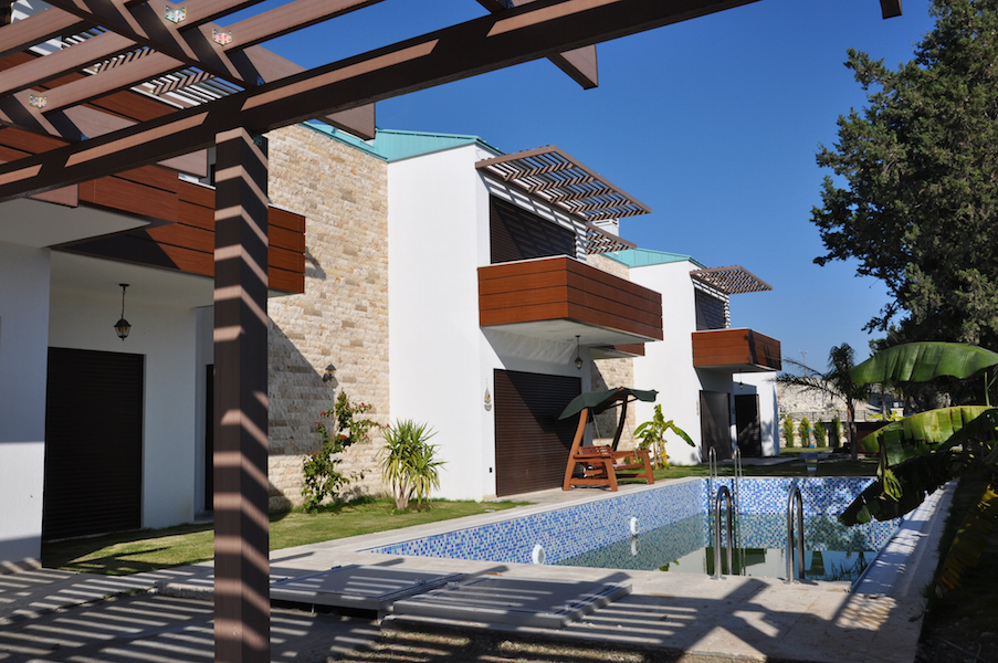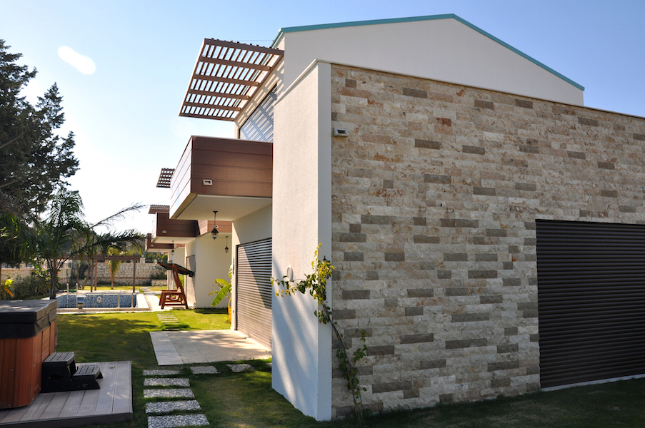 Local stone covering, stucco, teak veneered aluminium composite profiles and exposed concrete were used on exterior walls. For the interior, ceramic tiles and wooden parquet were specified, while for the outdoors, wood decking, pebble covered tiles, brushed concrete paving and grass surfaces were used.